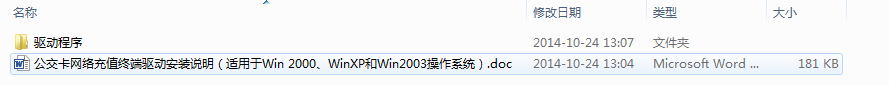 四.若系统是Win XP、Win 2000和Win 2003系统,则单击"适用Win XP、Win 2000和Win 2003操作系统"文件夹,具体安装说明请参考该文件下的"公交卡网络充值终端驱动安装说明(适用于Win 2000、WinXP和Win2003操作系统).doc"。