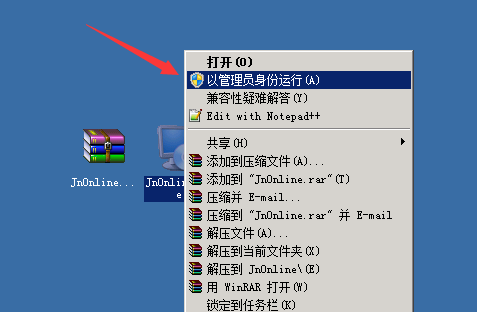 三.右键单击解压JnOnline.zip包,解压到当前文件夹,win7、win8和vista操作系统下右键点击JnOnline.exe选择菜单中的以管理员身份运行选项打开文件。按照安装提示,点击下一步