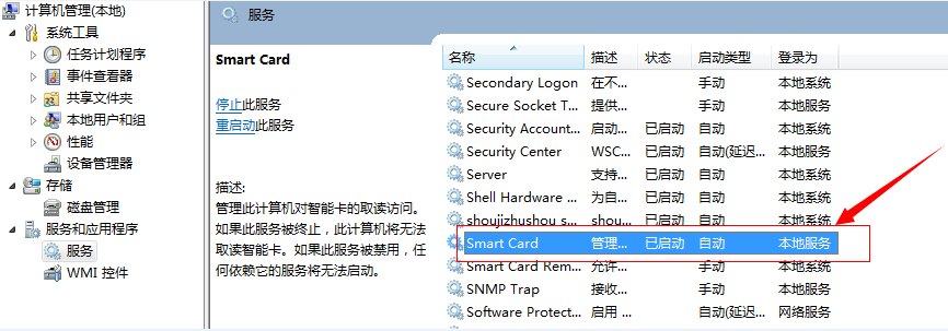 (1) 查看系统服务,右键单击"我的电脑",单击"管理",可以看见左侧树形目录下"服务和应用程序"中的"服务",单击"服务",查找名称为"Smart Card"的服务项,请确保该服务是启动状态,如果不是,请启动该服务,否则读卡终端无法使用。