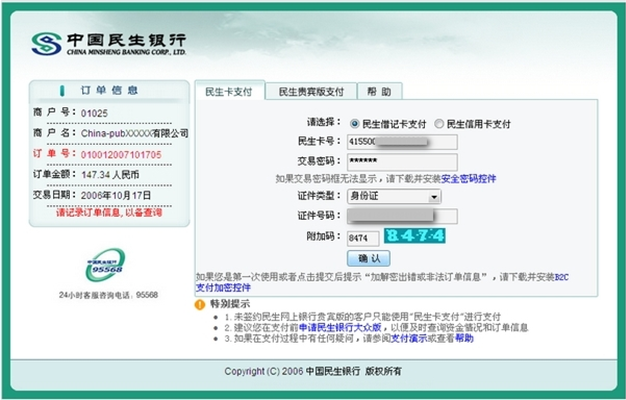 2.用户仔细核对页面左侧的订单信息,确认无误后,输入民生卡号、交易密码,选择与柜台办卡时相符的证件类型并输入证件号码,根据提示输入附加码然后点击“确认”。