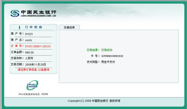 3.支付成功,页面提示交易结果。用户记录商户名称、订单号、订单金额等信息,以便日后查询。